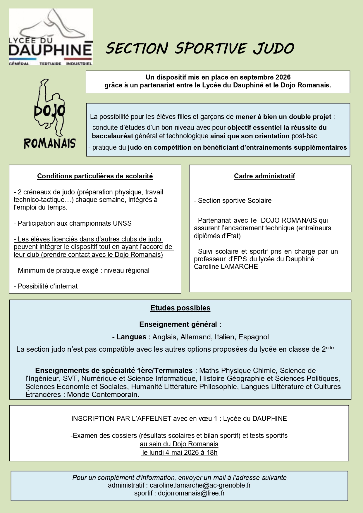 le lycée du Dauphiné situé à Romans sur Isère ouvre à la rentrée prochaine une section sportive judo réservée aux élèves entrant en Seconde GT ou première permettant de concilier la conduite d’étude d’un bon niveau et une pratique sportive exigeante du judo.
